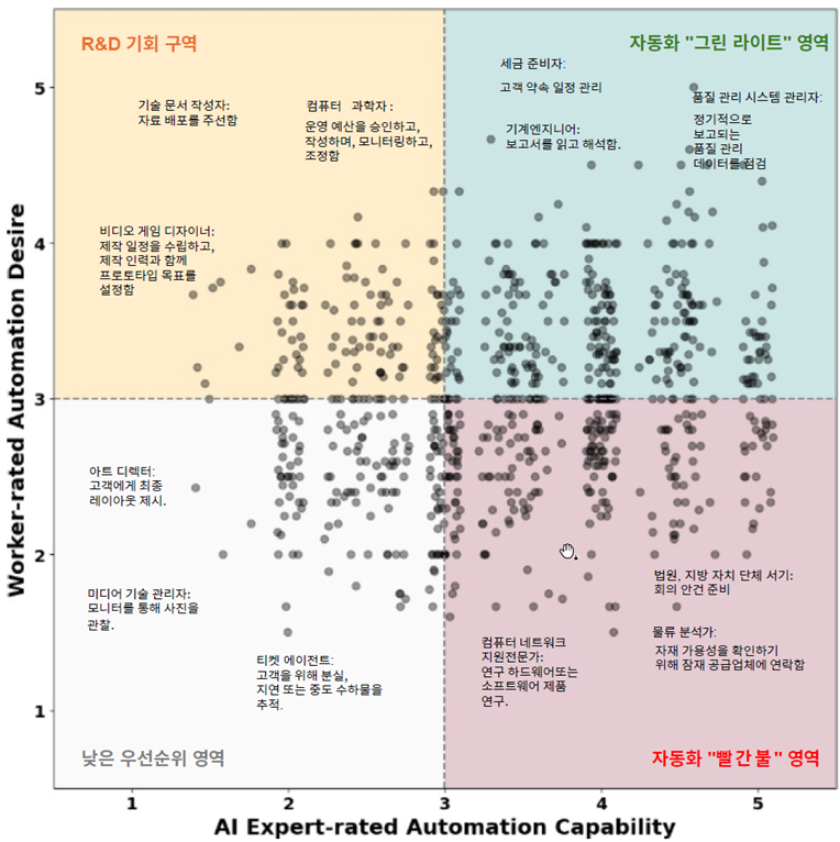 (출처: Yijia Shao 외, “Future of Work with AI Agents: Auditing Automation and Augmentation Potential across the U.S. Workforce”, arXiv:2506.06576v2, 2025.6.11. )