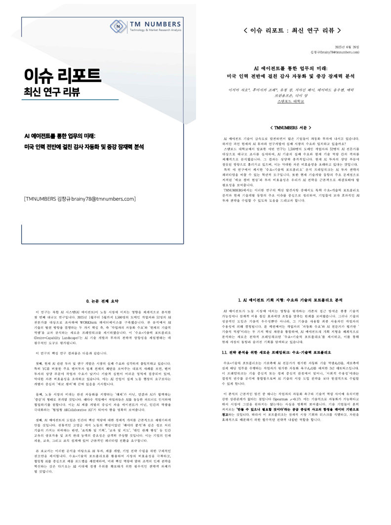 TMNUMBERS에서는 이러한 연구의 핵심 발견사항 중에서도 특히 수요-기술력 포트폴리오 분석과 현재 기술개발 동향의 주요 이슈를 중심으로 정리하여, 기업들이 보다 효과적인 AI 투자 전략을 수립할 수 있도록 도움을 드리고자 합니다.